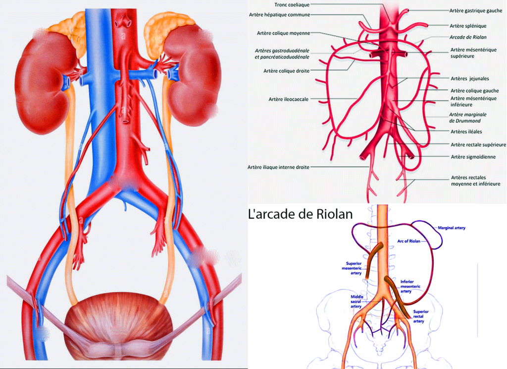 L’artère mésentérique infèrieure qui donne l’artère colique gauche qui rejoint l’artère colique moyenne, et les artères sigmoïdiennes, les deux se rejoignent.
